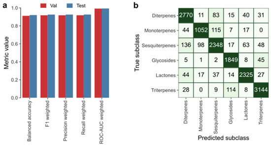 Figure 8b shows the confusion matrix obtained by applying LightGBM on the test data, from which we could calculate the weighted metrics shown in Figure 8a, since it denotes true positives, false positives, true negatives and false negatives for each subclass. Given the positive results obtained, the authors succeeded in applying a classifier capable of classification of terpene molecules on the grounds of their physicochemical properties.