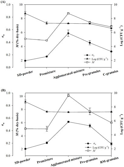 The SD powder, which is a fine, highly hygroscopic, and poorly flowable probiotic powder produced by spray-drying RSM fermented with LGG, was successfully granulated by the high-shear granulation process used in this study, regardless of the addition of RM in the premixing step (Figure 1). This process used moisture-activation for particle agglomeration, achieved by spraying a small amount of water (4%, w/w) as in MADG but differing from the original MADG process proposed by Ullah et al. [13] in that 70% (w/w) of microcrystalline cellulose (moisture absorbent) was added in the premixing step to avoid the over-wetting and over-agglomeration of the SD powder; the remaining 30% was added in the moisture absorption step. In addition, a short drying step (60 °C for 10 min) was added after the agglomeration step to reduce over-granulation and to control the final moisture content (M) and water activity (aw) of the granules, which is often omitted in MADG. No significant wall adhesion or large lump formation was observed during the formation of pre-granules in the granulator. To better understand this granulation process, the cell viability, M, and aw were monitored in each step of the process.
