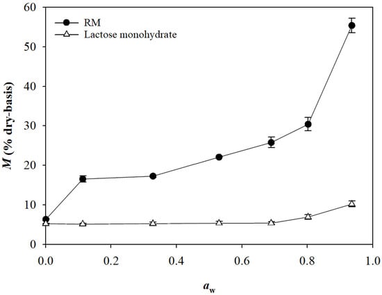 The MSIs of the lactose monohydrate and RM powders were determined at 25 °C using the gravimetric method of Yu et al. [38]. Briefly, lactose monohydrate or RM powder samples (~2 g) were spread evenly on pre-weighed aluminum dishes and placed in desiccators containing saturated P4O10 solution (0% relative humidity (RH)), followed by incubation at 25 °C until the mass change was <0.01 g. The samples were then transferred to desiccators containing saturated salt solutions of LiCl (11% RH), MgCl2 (33% RH), Mg(NO3)2 (53% RH), KI (69% RH), (NH4)2SO4 (80% RH), or KNO3 (94% RH) and further incubated at 25 °C until the mass change was <0.01 g. The M of the samples at equilibrium were measured by oven-drying at 105 °C for 24 h [37] and plotted with respect to water activity (aw = RH/100) to obtain MSIs.