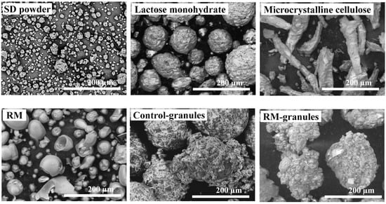 Figure 4 presents scanning electron microscopy (SEM) images of the ingredients used in the high-shear granulation process and the two types of granules produced. The SD powder and lactose monohydrate and RM particles displayed a semispherical shape, with volume-weighted mean diameters (d4,3) of 14.51, 110.25, and 80.67 µm, respectively, while microcrystalline cellulose particles had a rod-type shape with a d4,3 of 118.70 µm (Figure 4; Table S3). The Control- and RM-granules displayed a ‘snowball’ morphology due to the consolidation of ingredients and growth of consolidated particles, which is typically observed for granules produced by the HSWG process [5]. No significant difference in morphology was visually observed between the two types of granules.