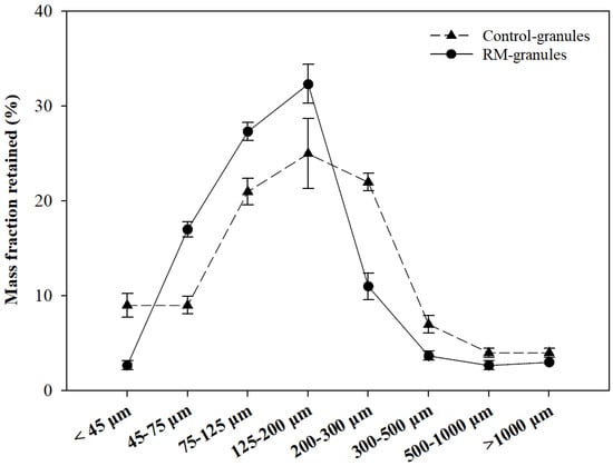Figure 5 presents the particle size distribution of the Control- and RM-granules based on the mass fraction obtained by sieve analysis. For the Control-granules, about 77% of the granules lay between 75 and 200 µm, and the highest fraction (about 25%) was observed in the size range of 125–200 µm. On the other hand, for the RM-granules, about 87% of the granules lay between 75 and 200 µm, and the highest fraction (about 32%) was observed in the size range of 125 to 200 µm. The RM-granules showed a larger d10 (57.67 µm), a much smaller d90 (294.67 µm), and a smaller span value (1.18) compared with the Control-granules (d10 = 34.33 µm, d90 = 436.67 µm, and span = 2.48) (Table 1). In particular, the mass fraction of very fine particles (<45 µm), which often cause problems in particle handling, was much smaller in the RM-granules (3%) than Control-granules (9%). The results indicate that the RM-granules had a narrower size distribution compared to the Control-granules, suggesting that the addition of RM to the formulation improved the distribution of water during the agglomeration and moisture absorption steps, resulting in a reduction of very fine particles and very large agglomerates. The mass mean diameters (dm) of the Control- and RM-granules were 204.20 µm and 161.98 µm, respectively (Table 1), indicating that the size of SD powder increased about 10-fold during this high-shear granulation process.