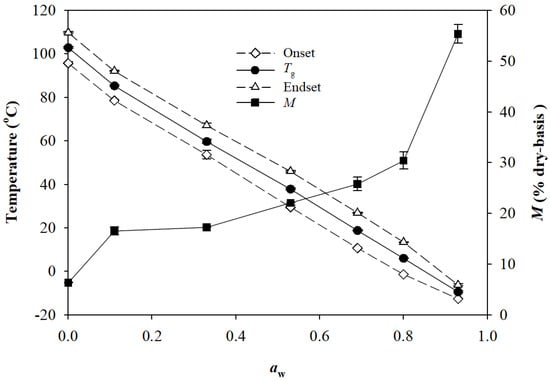 Onset, mid, and endset temperatures of endothermic steps in DSC thermograms of resistant maltodextrin (RM), equilibrated at 25 °C under different relative humidities (RH). The RH was expressed as water activity (aw = RH/100), and the midpoint was used as glass transition temperature (Tg).