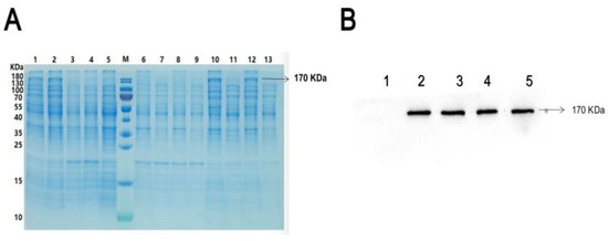 ROCK2wild expression in the ROCK2wild-pET-32a(+)-transformed E. colis and RHNs. (A) Expression of His-ROCK2wild by Coomassie brilliant blue. Marker (M) is the transformed E. colis cultured at 15 °C overnight with IPTG 0.2 mmol/L (1), at 15 °C overnight with IPTG 1.0 mmol/L (2), at 37 °C for 4 h with IPTG 0.2 mmol/L (3), at 37 °C for 4 h with IPTG 1.0 mmol/L (4), and at 15 °C overnight without IPTG (5); precipitation (6) and supernatant (7) of the transformed E. colis cultured at 37 °C with IPTG 1.0 mmol/L; precipitation (8) and supernatant (9) of the transformed E. colis cultured at 37 °C with IPTG 0.2 mmol/L; precipitation (10) and supernatant (11) of the transformed E. colis cultured at 15 °C with IPTG 1.0 mmol/L; precipitation (12) and supernatant (13) of the transformed E. colis cultured at 15 °C with IPTG 0.2 mmol/L. (B) Expression of ROCK2 by Western blot assay. (1) Empty plasmid-transformed E. colis; (2) lysate of RHNs; (3) supernatant of RHNs’ lysate; (4) lysate of ROCK2wild-pET-32a(+)-transformed E. colis; (5) precipitation of ROCK2wild-pET-32a(+)-transformed E. colis.