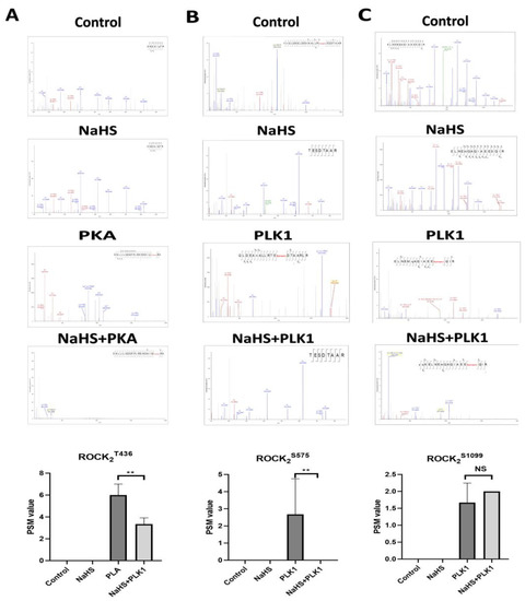 By using an LC–MS/MS (liquid chromatography–tandem mass spectrometry) assay, the impact of NaHS, a donor of H2S, on the related sites’ phosphorylation of His-ROCK2wild was investigated. As shown in Figure 2, in the absence of serine kinases PLK1 or threonine kinase PKA, no phosphorylation of any site of His-ROCK2wild was observed and NaHS (100 μmol/L) had no effect on the phosphorylation of any site of His-ROCK2wild in the absence of PLK1 or PKA. However, the addition of PLK1 (1 μg) and PKA (7.5 kU) led to the phosphorylation of GST-ROCK2wild at the Ser575 and Ser1099 sites. The peptide spectrum match (PSM) score, the proteins identified by mass spectrometry, significantly increased to 2.67 ± 2.08 from 0.0 ± 0.0 in the Ser575 site (p < 0.01). The PSM score in the Ser1099 site changed from 2.0 ± 0 to 1.67 ± 0.58. In the presence of PLK1, NaHS abolished the Ser575 phosphorylation of GST-ROCK2wild (p < 0.01) but had no obvious effect on the increased PSM score of the Ser1099 phosphorylation (p > 0.05); in the presence of PKA, the phosphorylation of GST-ROCK2wild at Thr436 occurred and NaHS remarkably decreased the PSM score of the Thr436 phosphorylation (p < 0.01). These results demonstrated that H2S could inhibit the phosphorylation of GST-ROCK2wild at the Thr436 and Ser575 sites.