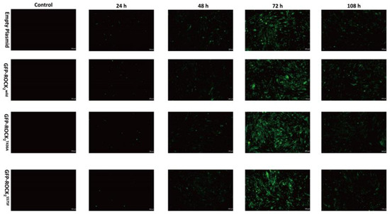 Representative images of RHNs transfected with empty, ROCK2wild-pEGFP-N1, ROCK2T436A-pEGFP-N1, and ROCK2S575F-pEGFP-N1 plasmids (100 μm). Transfection efficiency of the plasmids was determined by expression of green fluorescent protein (GFP). GFP showed green fluorescence.