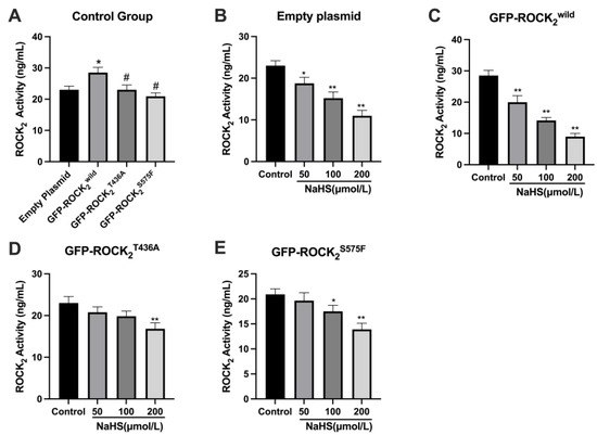Thr436 and Ser575 mediated the inhibition of NaHS on ROCK2 activity in transfected RHNs. (A) Comparison of ROCK2 activity of the control group. * p < 0.05 vs. empty plasmid group, # p < 0.01 vs. GFP-ROCK2wild group. (B) Empty plasmid-transfected RHNs. * p < 0.05, ** p < 0.01 vs. control group. (C) GFP-ROCK2wild-transfected RHNs. ** p < 0.01 vs. control group (GFP-ROCK2wild). (D) GFP-ROCK2S575F-transfected RHNs. ** p < 0.01 vs. control group (GFP-ROCK2S575F). (E) GFP-ROCK2T436A-transfected RHNs. * p < 0.05, ** p < 0.01 vs. control group (GFP-ROCK2T436A). (Mean ± SD, n = 3.)