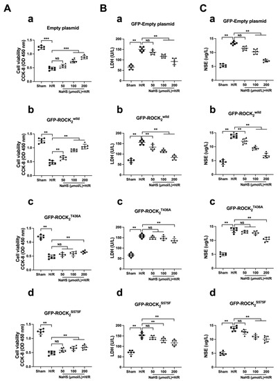 Thr436 and Ser575 mediate the effect of NaHS against H/R injury. (A) Cell viability: (a) empty plasmid group; (b) GFP-ROCK2wild group; (c) GFP-ROCK2T436A; (d) GFP-ROCK2S575F. (B) Release of LDH: (a) empty plasmid group; (b) GFP-ROCK2wild group; (c) GFP-ROCK2T436A; (d) GFP-ROCK2S575F. (C) Release of NSE: (a) empty plasmid group; (b) GFP-ROCK2wild group; (c) GFP-ROCK2T436A; (d) GFP-ROCK2S575F. ** p < 0.01, *** p < 0.001. (Mean ± SD, n = 6.)