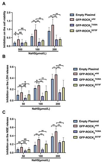 After obtaining the difference between the NaHS group and the H/R group and dividing by the value of the H/R group, we obtained the inhibition rate of different groups. In addition, Figure 7 shows that the inhibitions of 100 and 200 μmol/L of NaHS on the decreased cell viability and the increased LDH and NSE in the ROCK2T436A-pEGFP-N1- or the ROCK2S575F-pEGFP-N1-transfected RHNs were weaker than those in the ROCK2wild-pEGFP-N1-transfected RHNs. These results demonstrated that Thr436 and Ser575 of ROCK2 mediated the protective effect of H2S against an H/R injury in RHNs.
