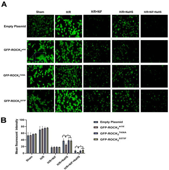 As shown in Figure 8A,B, compared with the sham group, H/R injury significantly increased the fluorescence intensity of the intracellular free Ca2+ concentration ([Ca2+]i) in the four types of the transfected RHNs. As with the Ca2+ channel inhibitor nifedipine (Nif, 100 μM), 100 μmol/L of NaHS markedly inhibited the H/R injury-increased fluorescence intensity of [Ca2+]i in each type of the transfected RHN. There was no significant difference among the inhibitions of Nif in the four types of the transfected RHNs. However, the inhibition of NaHS in the ROCK2wild-pEGFP-N1-transfected RHNs was significantly stronger than that in the empty plasmid-transfected RHNs. The inhibition of NaHS in either the ROCK2T436A-pEGFP-N1- or the ROCK2S575F-pEGFP-N1-transfected RHNs was remarkably weaker than that in the ROCK2wild-pEGFP-N1-transfected RHNs. The result indicated that Thr436 and Ser575 of ROCK2 are engaged with the inhibitory effect of H2S on [Ca2+]i in RHNs.