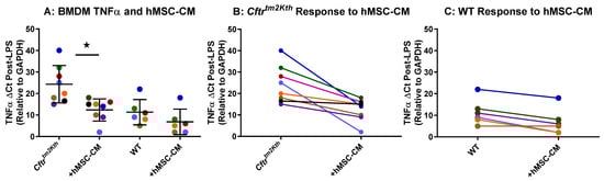 hMSC Anti-Inflammatory Potency Screen on Murine BMDM. Each of the pre-GMP donor preparations (shown by a different color) were cultured in the absence of antibiotics for 72 h. The supernatants were screened for the ability to suppress the production of TNFα from either murine WT or Cftrtm2Kth BMM stimulated with LPS (10 µg/mL, n = 8) (A). Evaluating each hMSC-CM individually, the Cftr-deficient (B, n = 8) and WT (C, n = 6) were analyzed. Consistent with previous studies, the hMSCs significantly decreased TNFα gene expression by the BMDM stimulated with LPS (star designates p < 0.05) with each hMSC-conditioned medium having a unique anti-inflammatory potency.
