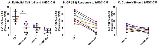 hMSC Anti-Inflammatory Potency Screen on Transformed Human Airway Epithelial Cells. Each of the pre-GMP donor preparations (shown by a different color) were cultured in the absence of antibiotics for 72 h. The supernatants were screened for the ability to suppress the production of IL-8 from either CF (IB3) or non-CF (S9) airway epithelial cell lines stimulated with LPS (10 µg/mL) (A). Evaluating each hMSC-CM individually, the CFTR-deficient cell line (B, IB3: n = 8) and control (C, S9: n = 8) were analyzed. Consistent with previous studies, the hMSCs significantly decreased IL-8 gene expression (star designates p < 0.05), with each hMSC condition medium having a unique anti-inflammatory potency.