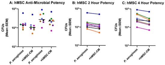 hMSC Anti-P. aeruginosa Potency Screen. Each of the hMSC-conditioned medium preparations generated without antibiotics were analyzed for antimicrobial potency against Pseudomonas aeruginosa. The hMSC-conditioned medium from each of the donors (shown by a different color) had antimicrobial potency (A). When each hMSC-conditioned medium preparations were analyzed individually for antimicrobial potency measuring CFUs at 2 h (B, n = 8) and 4 h (C, n = 8).