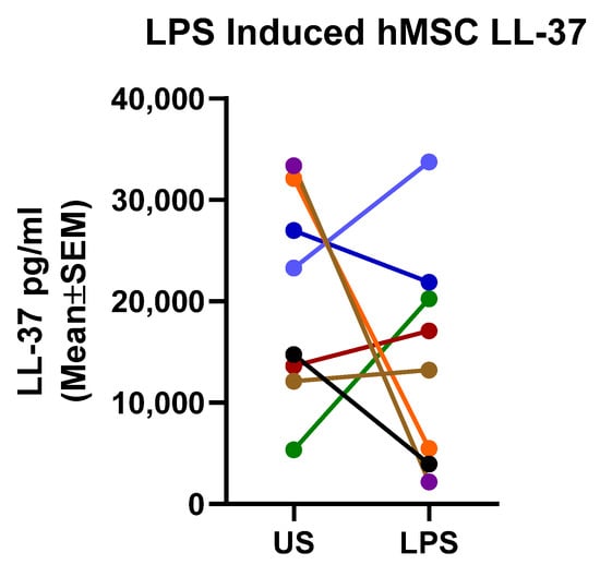To begin to define the molecular signature of the ideal hMSC with optimal anti-inflammatory and antimicrobial activity, each of the hMSCs were screened for LL-37 (Figure 4). Not surprisingly, the pre-GMP hMSCs produced significantly variable concentrations of LL-37 at baseline and post-response to LPS (Figure 4). Analysis of the LPS-induced LL-37 concentration versus the antimicrobial potency demonstrated significance (n = 8, p = 0.02, r = 0.081) using nonparametric ANOVA analysis, but only at 2 h. LPS-induced LL-37 concentration versus the antimicrobial potency at 4 h had an r = 0.67, p = 0.07 (n = 8).