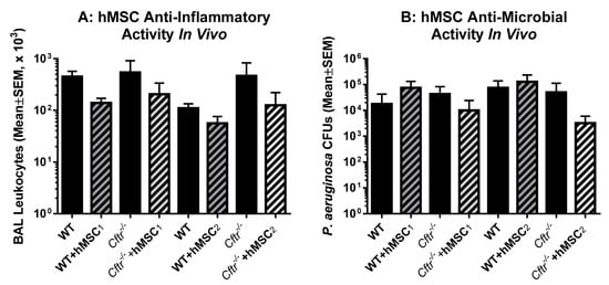 Cftr-deficient mice (Cftr-tm1Kth) were utilized to provide a modeling system that would mimic the excessive inflammatory response to P. aeruginosa infection as seen in CF [,,,]. These mice generally possess most of the pathophysiological sequela of CF and provide an efficient and unique platform to determine hMSC potency and in vivo efficacy. The Cftr−/− and Cftr+/+ mice were inoculated with a validated slurry of 106 CFUs of viable P. aeruginosa encased in agarose beads via the transtracheal route. Twenty-four hours after inoculation, hMSCs were infused at 106/100 µL through the retro-orbital sinus because of their efficient clearance into the lung. Each group of infected mice (WT and Cftr−/−) were subdivided into hMSC infusion or media control. The mice were monitored daily for 10 days for changes in body weight. Mice were euthanized and evaluated for pulmonary inflammation using bronchoalveolar lavage (BAL) and quantitative bacteriology of BAL fluid and whole lung homogenate.