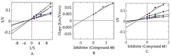 Mode of inhibition of α-glucosidase by compound 6f: (A) Lineweaver–Burk plot of reciprocal of rate of reaction (velocities) vs. reciprocal of substrate p-nitro phenyl-α-D-glucopyranoside in the absence of (■), and in the presence of 1.50 (●), 0.75 µM (●), and 0.200 µM (■) of compound 6f. (B) Secondary replot of Lineweaver–Burk plot between the slopes of each Lineweaver–Burk plot vs. different concentrations of compound 6f. (C) Dixon plot of reciprocal of rate of reaction (velocities) vs. different concentrations of compound 6f.