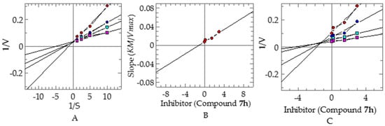To investigate their inhibitory mechanisms, the most potent compounds 6f and 7h were subjected to kinetic studies. Compound 6f exhibited a competitive type of inhibition, with a ki value of 0.84 ± 0.007 µM (Figure 3). In this type of inhibition, the inhibitor binds with the active site residue of enzyme and, therefore, Vmax remains the same, with an increase in the Km. The kinetic studies of compound 7h revealed a mixed type of inhibition, with a ki value of 1.18 ± 0.0012 µM (Figure 4). In this type of inhibition, both inhibitors—Vmax and Km—are affected by Vmax decreases and Km increases.