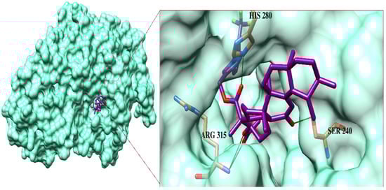The acetate and -OH groups of 2 mediated H-bonds with the side chains of Arg442 and Asp215, respectively. Meanwhile, the acetate moiety of 1 interacted with the side chains of Arg213 and His351. The binding modes of these compounds indicate that His280, Gln279, Asp215, His351, Arg442, and Arg315 are the important residues that provide H-bonds to these compounds, while Phe301 and Phe303 provide π–π interaction to most of the compound at the entrance of the active site. The binding mode of the most active hit is shown in Figure 5. The docking score of the compounds were in the range of −9.18 to −2.23 Kcal/mol. The atom-based protein–ligand interaction of each compound is tabulated in Table S1 (Supplementary Materials), along with their docking scores. The docking results support our experimental finding.
