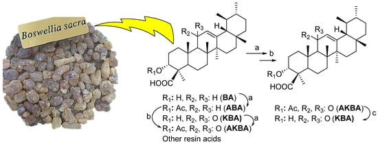 - Jauch, J.; Bergmann, J. An Efficient Method for the Large-Scale Preparation of 3-O-Acetyl-11-Oxo-β-Boswellic Acid and Other Boswellic Acids. Eur. J. Org. Chem. 2003, 2003, 4752–4756. [Google Scholar] [CrossRef]