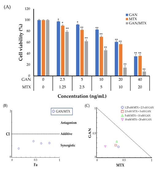 (A) Cell viability of A549 cells following treatment with either GAN or MTX alone or in combination. Data were expressed as mean ± SD. * p < 0.05 and ** p < 0.01 vs. untreated control. (B) Combination index plot (Fa-CI plot) of interaction between GAN and MTX against A549 cells. Fa: inhibitory effect, CI: combination index. An Fa of 0.5 represents 50% growth inhibition. (C) Isobologram generated with CompuSyn. Combination data points that fall below the line are synergistic; those above the line are antagonistic, and those on the line are additive.