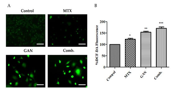 For quantitative assessment, 1 × 105 A549 cells were seeded in each well of a 6-well plate and exposed to GAN and MTX either alone or in combination (at stated concentrations). Subsequently, the treated and/or untreated cells were pelleted (1500 rpm; 37 °C for 2 min), and the pellets were mixed gently with DCFH-DA (10 µM) and were allowed an additional 30 min of incubation at 37 °C in the dark. Finally, the cells belonging to different groups were read for their DCF-DA mediated fluorescence using a Synergy H1 Hybrid multi-mode microplate Reader (BioTek, Winooski, VT, USA). The results were expressed in terms of fluorescence intensity percentages compared with the untreated control A549 group.