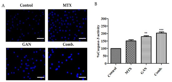 Caspases are a family of protease enzymes playing essential roles in transmitting signals during programmed cell death (apoptosis). These enzymes, upon conversion from pro to active forms, mediate the proteolytic cleavage of various crucial cellular proteins. Accordingly, to investigate whether the synergistic apoptotic potential of the combination therapy of GAN and MTX against A549 cells was mediated via the activation of caspases, the activity of caspase-3, the major downstream effecter caspase in apoptotic cascade, was evaluated in A549 cells post-treatment with GAN and MTX individually and in combination. As shown in Figure 3B, treatment with GAN and MTX individually and in combination efficiently triggered a substantial induction of caspase-3 activity in A549 cells. Caspase-3 activity was considerably increased upon GAN/MTX combinatorial therapy compared to the individual doses of GAN and MTX (Figure 3B).