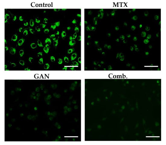 Regulation of mitochondrial membrane potential plays an important role in cell survival. Loss of mitochondrial membrane potential triggers the release of cytochrome C and apoptosis inducing factor (AIF) from mitochondria to the cytoplasm, which is a potent activator of the apoptotic caspase cascade. Accordingly, dissipation of mitochondrial membrane potential is thought to be an early indication of apoptotic cell death [26]. To examine the impact of GAN and MTX alone or in combination on mitochondrial function, the mitochondrial membrane potential of A549 cells was measured at 12 h post-treatment using the mitochondrial voltage-specific reporter rhodamine 123 (Rh 123). As shown in Figure 4, untreated control A549 cells preserved an intact mitochondrial membrane potential, which is depicted by efficient Rh 123 dye cellular uptake resulting in a high fluorescence intensity. In contrast, treatment with either GAN or MTX exerted a negative impact on the integrity of the mitochondrial membrane as manifested by a remarkable decrease in Rh 123 dye-related fluorescence intensity. Most importantly, a combined treatment with GAN and MTX elicited a further decrease in the mitochondrial membrane potential in A549 cells compared to individual treatments with either GAN or MTX, validating the involvement of mitochondria-induced apoptosis in the cytotoxic effect of the combined therapy.