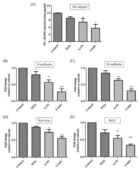 Effects of GAN and MTX alone or in combination on (A) concentration of NF-κB/p65; (B) mRNA expression of E-cadherin; (C) mRNA expression of N-cadherin; (D) mRNA expression of survivin; (E) mRNA expression of Bcl-2. * p < 0.05, ** p < 0.01 and *** p < 0.001.