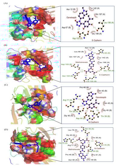 Two-dimensional interaction complex of (A) GAN and (C) MTX with E-cadherin protein, where red shows the target protein, purple shows the ligand molecule, and the black circle shows the enlarged view of docked complex. Two-dimensional interaction complex of (B) GAN and (D) MTX with N-cadherin protein, where red shows the target protein, purple shows the ligand molecule, and the black circle shows the enlarged view of the docked complex.