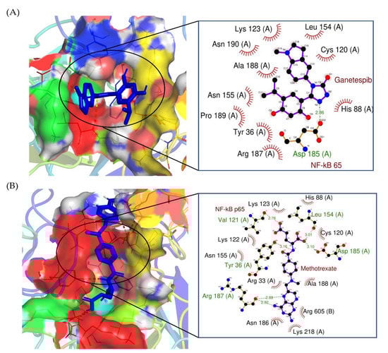 Two-dimensional interaction complex of (A) GAN and (B) MTX with NF-κB/p65 protein, where red shows the target protein, purple shows the ligand molecule, and the black circle shows the enlarged view of the docked complex.