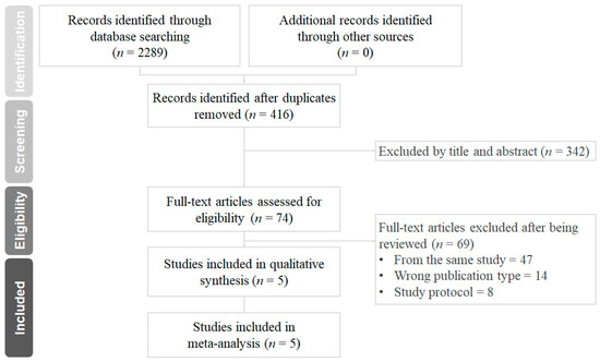 The results of the database search and study selection are shown in Figure 1. A total of 2289 records were identified from the databases and websites mentioned above. Of these, 74 full-text articles were reviewed, and 69 of them were excluded for not meeting the pre-specified inclusion criteria. In the end, five randomized controlled trials with a total of 21,034 patients were included in this meta-analysis. The main characteristics and outcomes of the included trials were summarized in Table 1. There were 10,556 patients who received standard 12-month DAPT, and 10,478 patients received P2Y12 inhibitor monotherapy after PCI and stent implantation. The ischemic and bleeding events of each trial are summarized in Table 2.