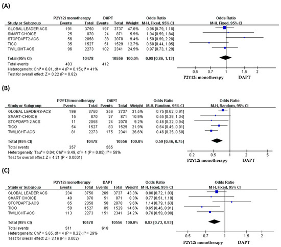 The following supporting information can be downloaded at: https://www.mdpi.com/article/10.3390/ph16020232/s1, Figure S1: The funnel plots of each outcome. (A) MACCE, (B) major or minor bleeding, (C) NACE; Table S1: EMBASE search strategy; Table S2: PubMed search strategy; Table S3: Cochrane Library search strategy; Table S4: Bias risk assessment of the studies.