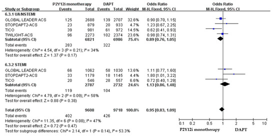 The efficacy and safety outcomes of P2Y12 inhibitor monotherapy in STE-ACS versus NSTE-ACS patients in these included clinical trials were demonstrated in Figure 7 and Figure 8. The incidence of ischemic events was similar between P2Y12 inhibitor monotherapy and DAPT in both STE-ACS (OR: 1.13, 95% CI: 0.86–1.48, p = 0.38) and NSTE-ACS patients (OR: 0.89, 95% CI: 0.76–1.05, p = 0.17). P2Y12 inhibitor monotherapy significantly reduced bleeding events as compared with 12-month DAPT in both STE-ACS (OR: 0.68, 95% CI: 0.49–0.96, p = 0.03) and NSTE-ACS patients (OR: 0.60, 95% CI: 0.51–0.71, p < 0.0001). The SMART-CHOICE study was not included in the subgroup analysis because there was no available reported data on the different diagnoses of ACS.