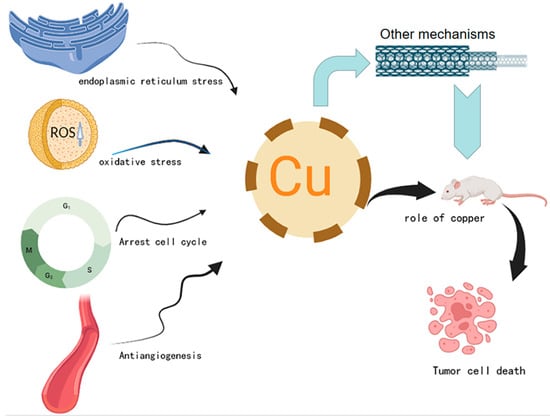 The primary mechanism of copper-induced cell death. Activating stress pathways (endoplasmic reticulum stress and oxidative stress), blocking the cell cycle, and anti-angiogenesis are all used to treat cancer by controlling copper levels and utilizing the cytotoxicity produced by copper excess to kill tumor cells. There are other therapeutic mechanisms to treat cancer by reaching the tumor’s exact location in mice suffering from the tumor and causing tumor cell death under the action of copper.