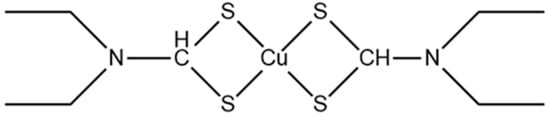 - Chen, W.; Yang, W.; Chen, P.; Huang, Y.; Li, F. Disulfiram Copper Nanoparticles Prepared with a Stabilized Metal Ion Ligand Complex Method for Treating Drug-Resistant Prostate Cancers. ACS Appl. Mater. Interfaces 2018, 10, 41118–41128. [Google Scholar] [CrossRef]
