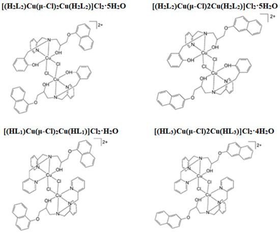 Chemical structure of [(H2L2)Cu(μ-Cl)2Cu(H2L2)]Cl2·5H2O, [(H2L2)Cu(μ-Cl)2Cu(H2L2)]Cl2·5H2O, [(HL1)Cu(μ-Cl)2Cu(HL1)]Cl2·H2O, [(HL3)Cu(μ-Cl)2Cu(HL3)]Cl2·4H2O.