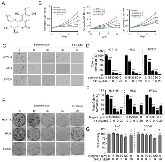 Bergenin inhibits proliferation of CRC cells. The chemical structure of bergenin is shown in (A). (B) Cell viability analysis of HCT116 (left), HT29 (middle), and SW620 (right) cells was evaluated using the MTS assay following bergenin or 5-Fu treatment. 5-Fu was used as positive control. Data are represented as mean ± SD (n = 3). * p < 0.05, ** p < 0.01, *** p < 0.001. (C,D) Colony formation of bergenin-treated or 5-Fu-treated HCT116, HT29, and SW620 cells was analyzed by the soft agar method. 5-Fu was used as positive control. (C) Colony formation images. Scale bar, 200 μm. (D) Quantification. Data are represented as mean ± SD (n = 3). *** p < 0.001. (E,F) The plate colony formation of HCT116, HT29, and SW620 cells following bergenin or 5-Fu treatment. 5-Fu was used as positive control. (E) Colony formation images. (F) Quantification. Data are represented as mean ± SD (n = 3). * p < 0.05, *** p < 0.001. (G) Cell viability of immortalized FHC and CCD841 non-tumor cells following their treatment with bergenin or 5-Fu for 72 h was analyzed separately by the MTS method. 5-Fu was used as positive control. Data are represented as mean ± SD (n = 3). * p < 0.05, #, not statistically significant. CRC, colorectal cancer; MTS, (3-(4,5-dimethylthiazol-2-yl)-5-(3-carboxymethoxyphenyl)-2-(4-sulfophenyl)-2H-tetrazolium; 5-Fu; 5-fluorouracil.