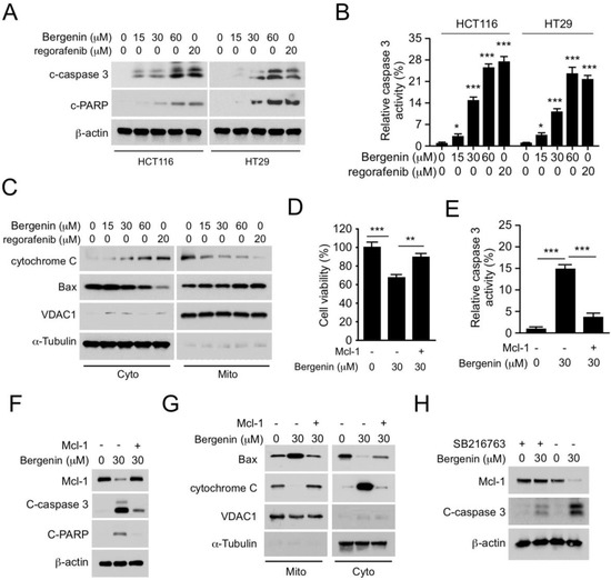 Bergenin induces apoptosis of CRC cells, * p < 0.05, ** p < 0.01, *** p < 0.001. (A,B) Bergenin−treated or regorafenib−treated HCT116 and HT29 cells were cultured for 48 h. WCE were collected for IB analysis (A), and caspase 3 activity was assessed with the caspase−3 assay kit (B), Regorafenib was used as positive control. Data are represented as mean ± SD (n = 3). (C) HCT116 cells were treated with bergenin or regorafenib for 48 h. Subcellular fractions were isolated and subjected to IB analysis. Regorafenib was used as positive control. (D–G) HCT116 cells were transfected with Mcl-1 for 24 h, followed by treatment with bergenin for 48 h. The MTS assay was used to assess cell viability (D), The caspase−3 assay kit was used to assess caspase 3 activity (E), WCE were collected for IB analysis (F), and the subcellular fractions was isolated for IB analysis (G). Data are represented as mean ± SD (n = 3). (H) Bergenin-treated or SB216763−treated HT29 cells were cultured for 48 h. WCE were collected for IB analysis. CRC, colorectal cancer; WCE, whole cell extracts; IB, immunoblotting; MTS, (3−(4,5−dimethylthiazol−2−yl)−5−(3−carboxymethoxyphenyl)−2−(4−sulfophenyl)−2H−tetrazolium.