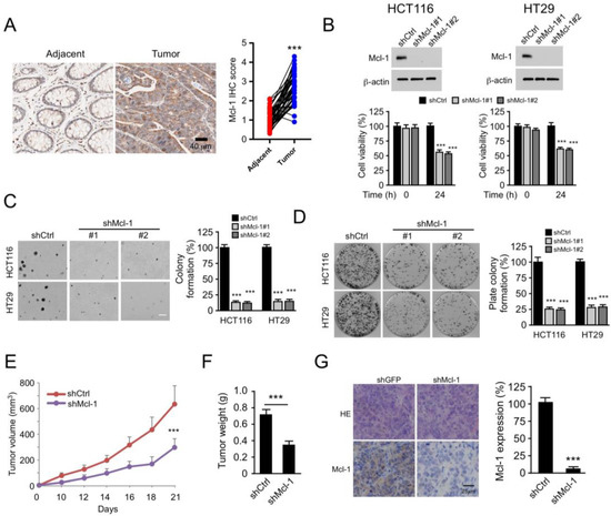 Evasion of cell death is one of the main hallmarks of cancer [23]. As a key factor in resistance to apoptosis, we next investigated whether Mcl-1 is necessary for the tumorigenic properties of CRC. To determine the differential expression of Mcl-1 in CRC, the expression levels of this protein were compared in 43 CRC samples and adjacent non-cancerous tissues by immunohistochemical staining. The results indicated that the expression levels of Mcl-1 were significantly upregulated in CRC tissues compared with those noted in paired adjacent tissues (Figure 5A). Mcl-1 depleted HCT116 and HT29 stable cell lines were established to determine the role of Mcl-1 in CRC cells. The MTS assay indicated that depletion of Mcl-1 reduced cell viability (Figure 5B). The ability of the cells to divide independently of contact with the extracellular matrix or the neighboring cells is one of the typical characteristics of tumor cells. Therefore, Mcl-1 knockdown HCT116 and HT29 cells were incubated as single cells in soft agar, and the results demonstrated impaired anchorage-independent colony formation potential of CRC lineage cells following knockdown of Mcl-1 expression (Figure 5C). The plate colony formation assay further indicated that the knockdown of Mcl-1 expression reduced the colony formation ability of HCT116 and HT29 cells (Figure 5D). Subsequently, xenograft mouse models, were constructed using HCT116-short hairpin RNA (sh)Ctrl and HCT116-shMcl-1 stable cells. The data indicated that downregulation of Mcl-1 expression inhibited in vivo tumor growth (Figure 5E–G). These results suggested that Mcl-1 was required for CRC growth.
