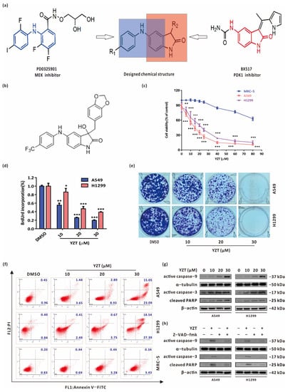 Compound YZT suppresses NSCLC cell growth. (a) Design and synthesis of the new MEK/PDK1 dual inhibitors. (b) Chemical structure of Compound YZT. (c) CCK-8 assay indicated that YZT dose-dependently reduced the viability of A549 and H1299 cells but has almost no influence on that of MRC-5 cells. (d) Cell proliferation was monitored by BrdU labeling detection. (e) Cell survival was measured by colony formation assay. (f) Annexin V-FITC/PI apoptosis assay revealed that YZT dose-dependently promotes apoptosis of A549 and H1299 cells but hardly has impact on that of MRC-5 cells. (g) Western blotting was used to analyze the expression of active caspase-9, active caspase-3 and cleaved PARP after YZT treatment. (h) NSCLC cells were pretreated with Z-VAD-fmk before YZT incubation, then Western blotting was applied to detect the expression of active caspase-9, active caspase-3 and cleaved PARP. Significant differences were designated as * p < 0.05, ** p < 0.01 and *** p < 0.001.