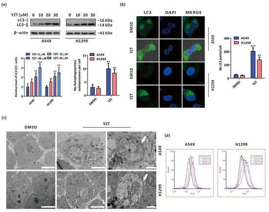 Growing evidence has suggested that autophagy exerts a pivotal function in the anticancer activities of chemotherapeutic drugs [15,16,17]. To clarify whether YZT induces autophagy in NSCLC cells, the classical autophagy protein LC3 was detected by immunoblotting, which showed that YZT increased the level of LC3-II in a dose-dependent manner (Figure 2a). In addition, immunofluorescence indicated that the quantity of LC3 puncta was significantly increased by YZT (Figure 2b). Furthermore, transmission electron microscopy(TEM) was employed to directly observe the morphology of autophagosomes. TEM showed that the cells in the YZT group clearly had a classic ultrastructural morphology of autophagosome bilayer vacuoles compared to the DMSO control (Figure 2c). Finally, another typical characteristic of autophagy, acidic vesicular organelles (AVOs), can be examined by AO staining. The results indicated that YZT facilitated the formation of AVOs in a dose-dependent way (Figure 2d).