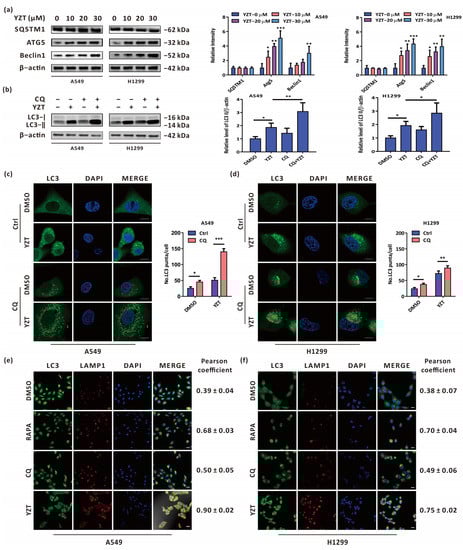 To delve into the effect of YZT on autophagy, it is worth determining whether YZT promotes complete autophagic flux. For this purpose, firstly, immunoblotting was adopted to measure the autophagy-related proteins SQSTM1, Atg5 and Beclin1. The results indicated that Atg5 and Beclin1 were upregulated in a dose-dependent manner, but SQSTM1 showed no significant difference following YZT administration (Figure 3a). Furthermore, the level of LC3 was tested by immunoblotting to determine the impact of the autophagy inhibitor CQ on YZT. Immunoblotting showed that LC3 was markedly increased by YZT plus CQ compared with YZT alone (Figure 3b). Similar results were obtained when immunofluorescence was used to observe the endogenous LC3 puncta (Figure 3c,d). Because autophagosomes can fuse with lysosomes in complete autophagic flux, immunofluorescence was employed to monitor this process by observing the colocalization of LC3 and LAMP1 which is a biomarker protein of lysosomes. The analysis of the Pearson correlation coefficient revealed that, as the negative control, the autophagy inhibitor CQ could propel the segregation of LC3 and LAMP1and, closely analogous to the autophagy inducer RAPA, YZT promoted the overlap of LC3 and LAMP1 (Figure 3e,f).
