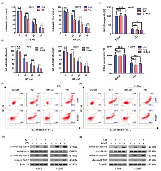 Autophagy blockade reinforces the anticancer activities of Compound YZT. (a,b) CCK-8 assay indicated that the combination of YZT with CQ (a)/3-MA (b) strengthens the inhibitory action on cell viability compared with YZT alone. (c) Cell proliferation was measured by BrdU labeling detection. (d,e) Annexin V-FITC/PI apoptosis assay indicated that combined administration of YZT with CQ (d)/3-MA (e) enhances cell apoptosis compared to YZT alone. (f,g) The expression of active caspase-9, active caspase-3 and cleaved PARP were examined by western blotting. Significant differences were designated as * p < 0.05, ** p < 0.01 and *** p < 0.001.