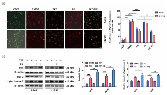 Considering that our previous study verified that the novel PDK1/MEK dual inhibitor can promote mitochondrial apoptosis in NSCLC cells [18], we attempted to determine whether autophagy exerts an influence on YZT-mediated mitochondrial apoptosis. A crucial process in mitochondrial apoptosis is the decrease in the mitochondrial membrane potential (MMP), which is subsequently followed by the release of mitochondrial cytochrome C to cytoplasm [19]. MMP can be measured by JC-1 staining assay in which the relative intensity of red/green fluorescence represents the ratio of mitochondrial depolarization. The results showed that combination with CQ intensified the YZT-mediated downregulation of MMP (Figure 5a). In addition, western blotting indicated that combination with CQ aggravated the YZT-mediated increase of Bax/Bcl-2 ratio and the level of cytochrome C (Figure 5b).