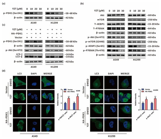 Since YZT was synthesized by dual targeting of PDK1 and MEK, immunoblotting was applied to study the impact of YZT on the expression of PDK1. The results validated that YZT dose-dependently reduced the expression of p-PDK1(Ser241) in NSCLC cells (Figure 6a). Subsequently, we queried the-STRING-database (http://string-db.org, accessed on 28 September 2022) to analyze protein-protein interactions (PPIs) for PDK1. We observed that Akt and mTOR interact with PDK1 (Supplementary Figure S1). Furthermore, Kyoto Encyclopedia of Genes and Genomes (KEGG) analysis indicated that PDK1 is an upstream protein of the Akt/mTOR axis (Supplementary Figure S2). Increasing evidence suggests that the Akt/mTOR axis is a classical negative regulatory signaling route for autophagy [20,21], and we investigated whether YZT initiates autophagy via the Akt/mTOR axis. Immunoblotting demonstrated that YZT reduced the levels of p-Akt(Ser473), p-mTOR(S2448), p-4EBP1(Ser65) and p-p70s6k(Thours470) in a dose-dependent manner (Figure 6b). To validate whether YZT induces autophagy and regulates the Akt/mTOR axis via PDK1, p-Akt(Ser473) and LC3 were measured by immunoblotting in PDK1-overexprssing cells. As indicated in Figure 6c, overexpression of PDK1 partially eliminated the downregulatory effect of YZT on p-Akt(Ser473) and counteracted the YZT-mediated increase in LC3-II. To further study the impact of PDK1 on YZT-induced autophagy, immunofluorescence was used to monitor endogenous LC3 puncta when PDK1 was overexpressed. The results demonstrated that PDK1 overexpression significantly neutralized the YZT-mediated increase in endogenous LC3 puncta (Figure 6d).