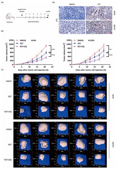 A549 and H1299 cells were hypodermically injected into nude mice. When the xenotransplanted tumors became visible, the nude mice were allocated into three groups (5 mice/group) at random and injected with DMSO, YZT or YZT plus CQ through the tail vein. The dosage regimen was as follows: the dosages of YZT and CQ were 10 mg/kg and 80 mg/kg [9,22], respectively; the interval of administration was 2 days; and the total administration was six times (Figure 7a). Tumor volumes were measured before each drug administration. As indicated in Figure 7b, YZT markedly decreased the tumor volumes compared with the DMSO control. Furthermore, YZT plus CQ inhibited tumor growth more strongly than YZT alone. All images of tumor tissues were obtained on the 21st day after sacrifice (Figure 7c). In addition, immunohistochemistry demonstrated that the level of LC3 was increased by YZT (Figure 7d), which is consistent with the in vitro results.