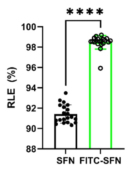 Radiolabeling efficiency (RLE) of the SFN and FITC-SFN measured in the optimized conditions. Unpaired t-test: ****, p < 0.0001; (n = 20).