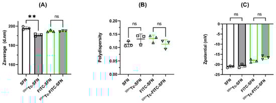The in vitro stability of the radiolabeled NPs was evaluated in saline (0.9% NaCl) and blood serum from human healthy donors [48]. Briefly, suspensions of 35.52 ± 0.81 MBq/mg of [99mTc]Tc-SFN (n = 3) or 34.04 ± 0.16 MBq/mg of [99mTc]Tc-FITC-SFN (n = 3) were mixed with 2 mL of the medium and incubated for 4 h at 37 °C under gentle stirring. The stability of the radiolabeling was tested by measuring the radiochemical purity at 0, 1, and 4h of incubation. Samples from serum incubation were mixed with acetonitrile (1:1), centrifuged at 14,100× g for 30 min, and the supernatant was recovered for iTLC, as described in Section 4.6. Next, NPs were stored at 4 °C until no detectable activity was measured. Then, suspensions were centrifuged, and pellets were suspended at 1 mg/mL for further characterization.