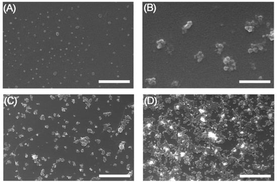 FESEM images of the NPs after incubation in serum: (A) SFN; (B) FITC-SFN; (C) [99mTc]Tc-SFN; (D) [99mTc]Tc-FITC-SFN. Scale bars = 500 nm, (A,B); 2 μm, (C,D).