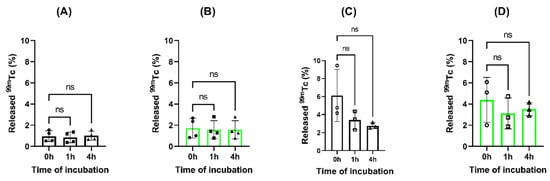 Analysis of released 99mTc from the loaded nanoparticles during the time of study: (A) [99mTc]Tc-SFN in 0.9% NaCl; (B) [99mTc]Tc-FITC-SFN in 0.9% NaCl; (C) [99mTc]Tc-SFN in blood serum and (D) [99mTc]Tc-FITC-SFN in blood serum. ANOVA: n.s., p > 0.05; (n = 3).