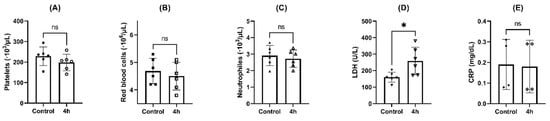 Effects of NPs on hematological parameters after incubation for 4 h at 37 °C: (A) platelets; (B) red blood cells; (C) neutrophils; (D) LDH; and (E) CRP. Paired t-test: ns = p > 0.05; * = p < 0.05, (n = 6).